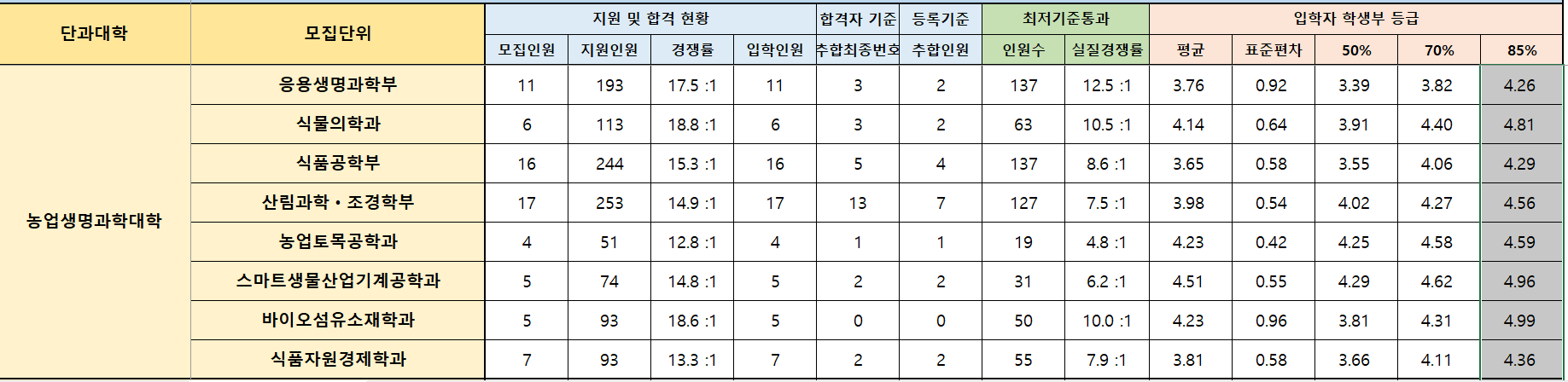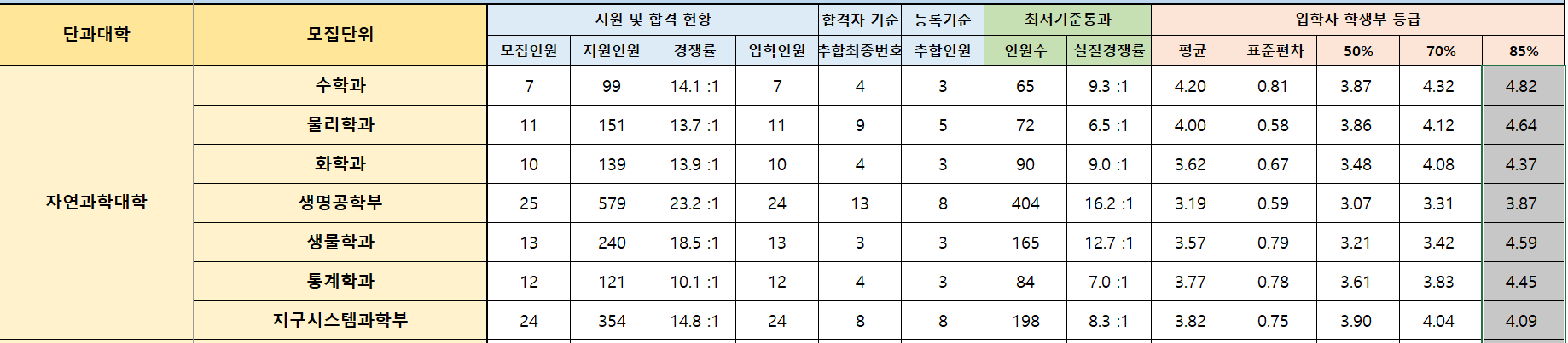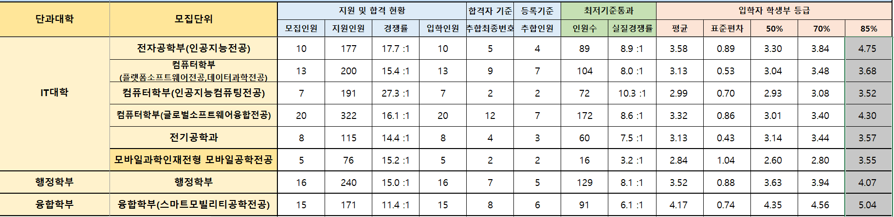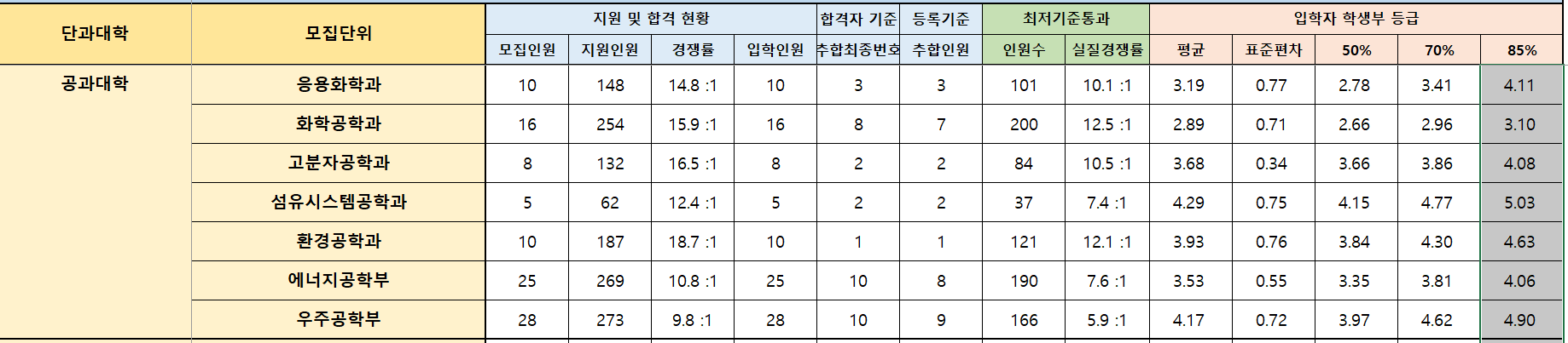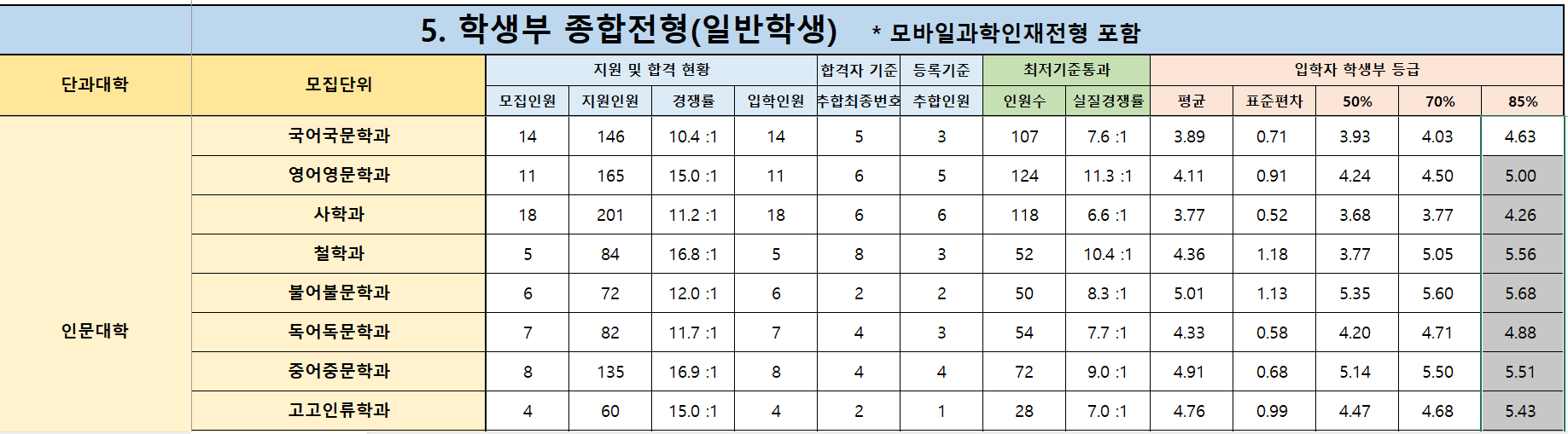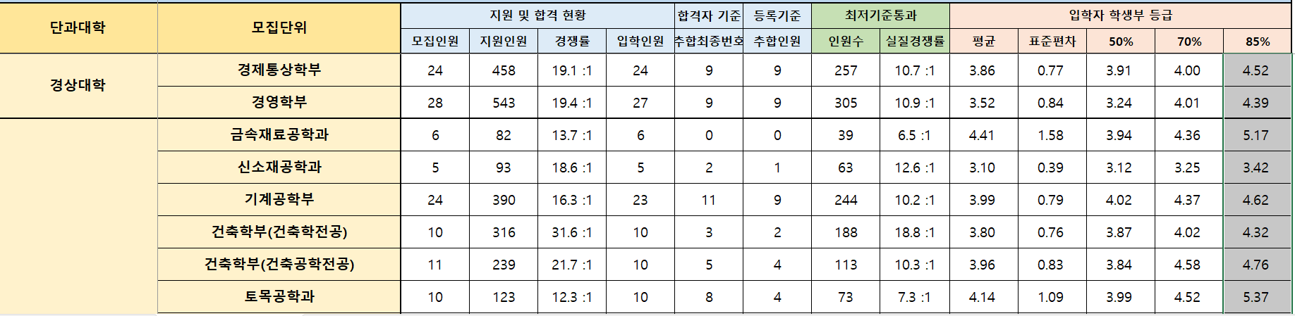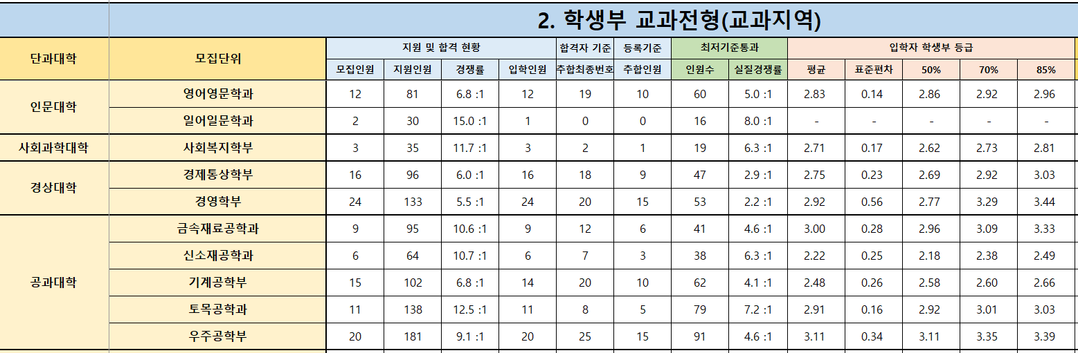 학생부 교과전형(교과우수) 인문대학, 사회과학대학, 자연과학대학경상대학, 공과대학의 입학자 학생부 등급 85% cut을 보면 대부분 2점대 후반에서 3점대 초반에 분포해있습니다.
