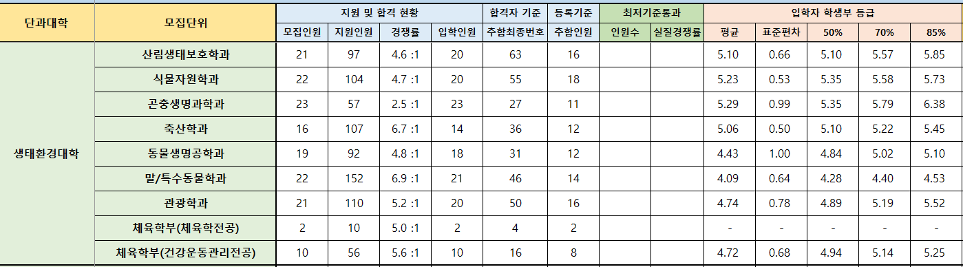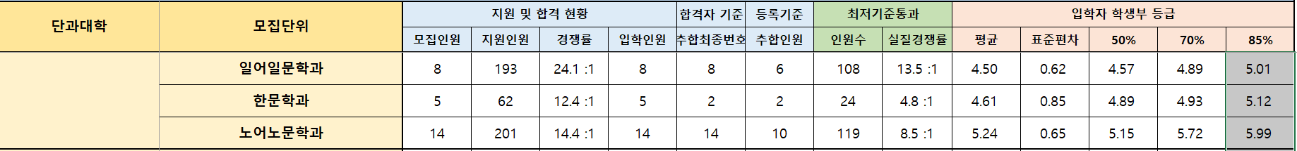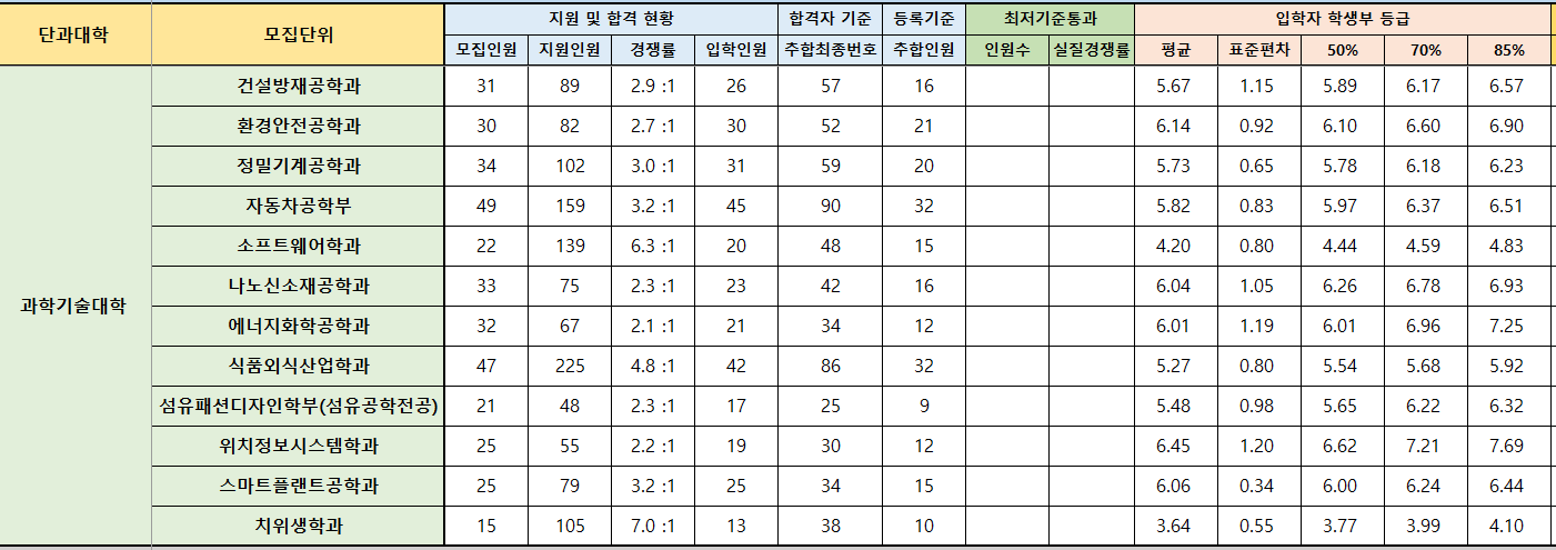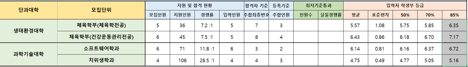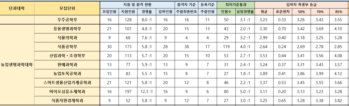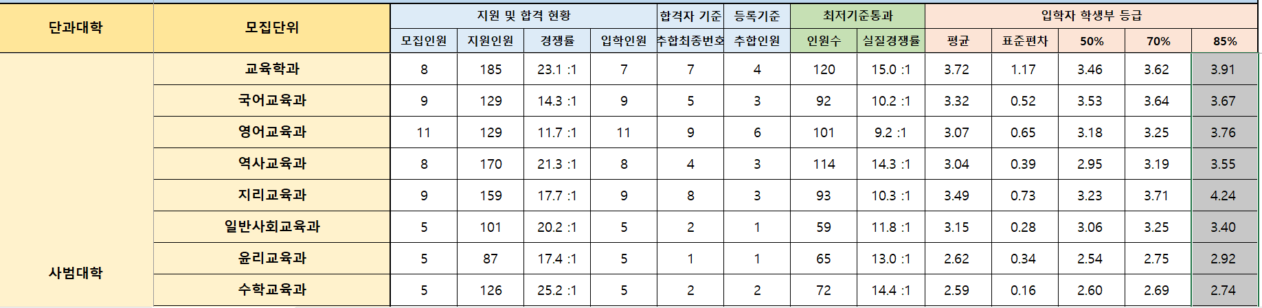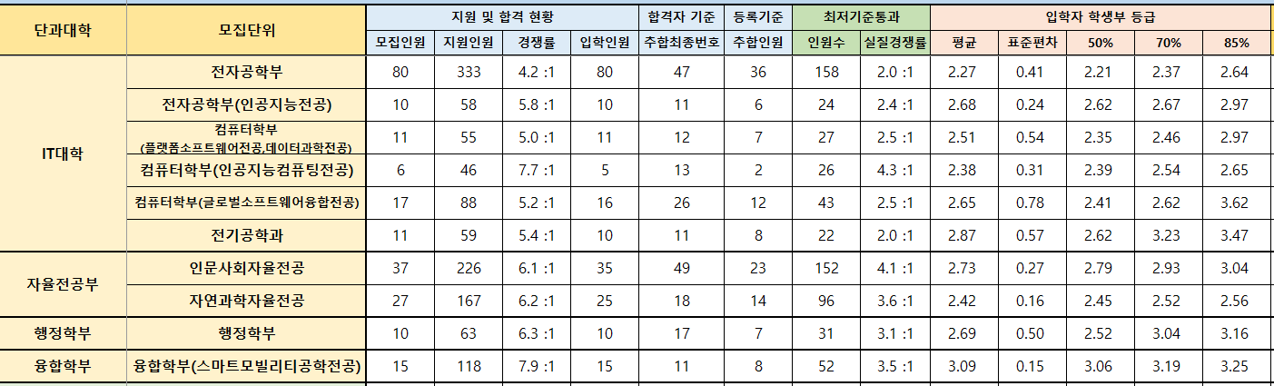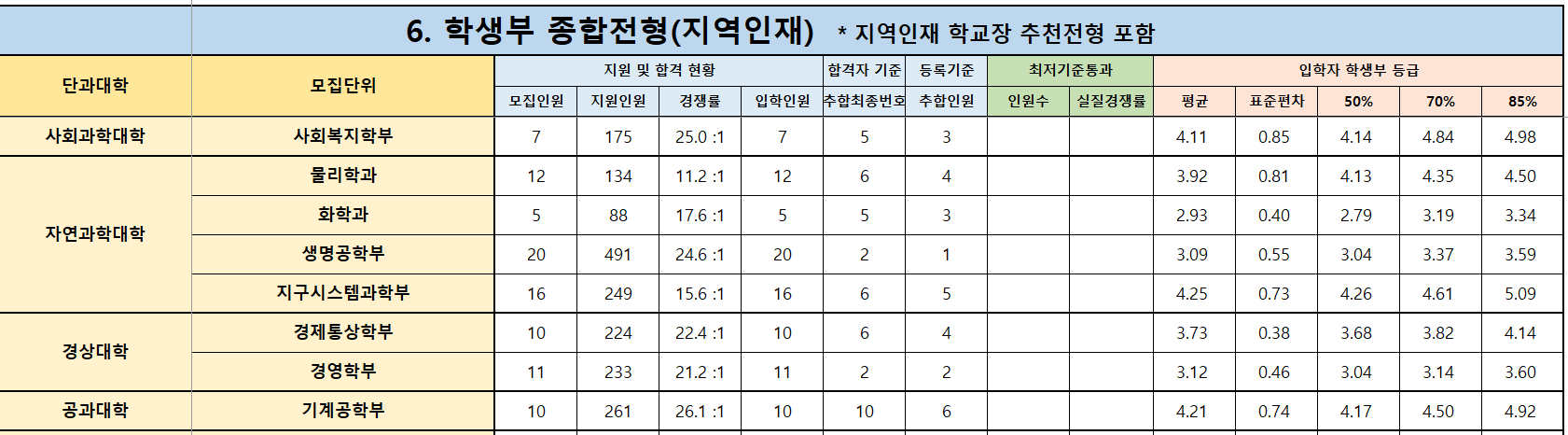 학생부 교과전형(교과우수) 인문대학, 사회과학대학, 자연과학대학경상대학, 공과대학의 입학자 학생부 등급 85% cut을 보면 대부분 2점대 후반에서 3점대 초반에 분포해있습니다.