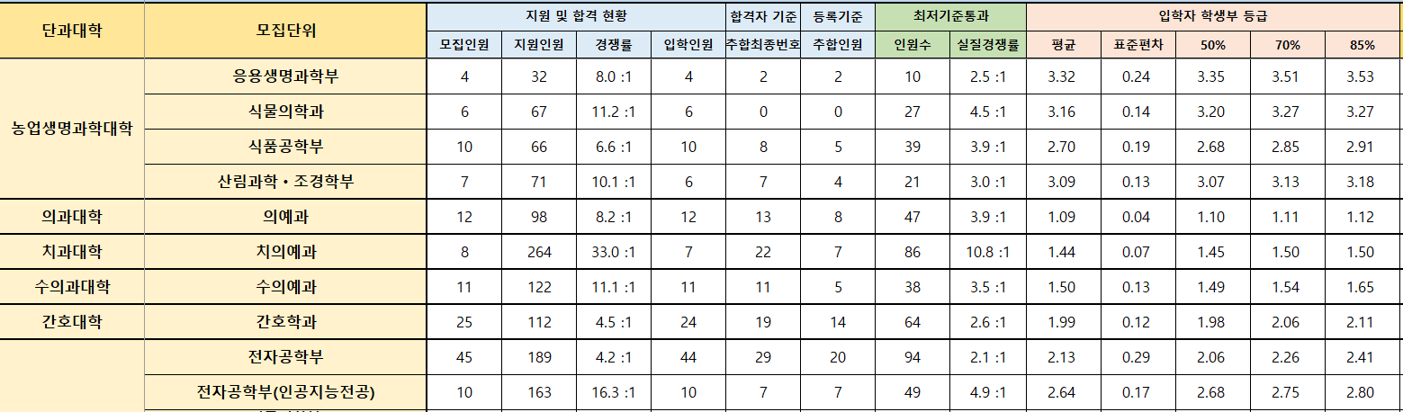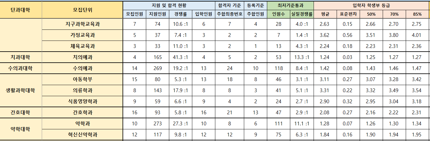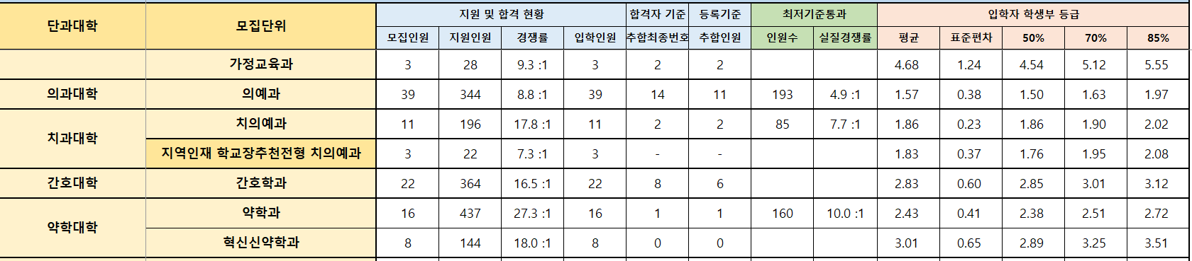 학생부 교과전형(교과지역)에서는 모집단위 의예과는 85% cut이 1.12등급, 치의예과는 1.50, 수의예과는 1.65등급입니다.