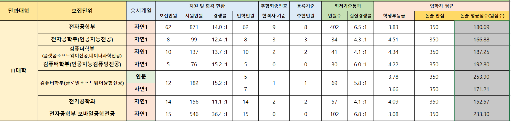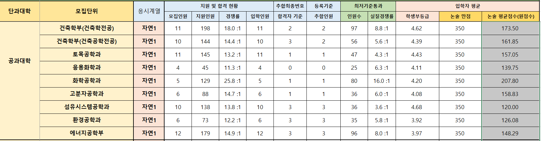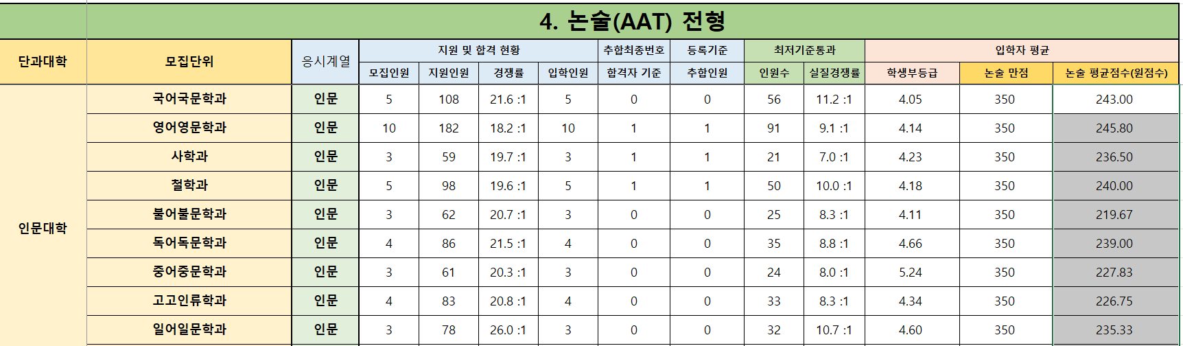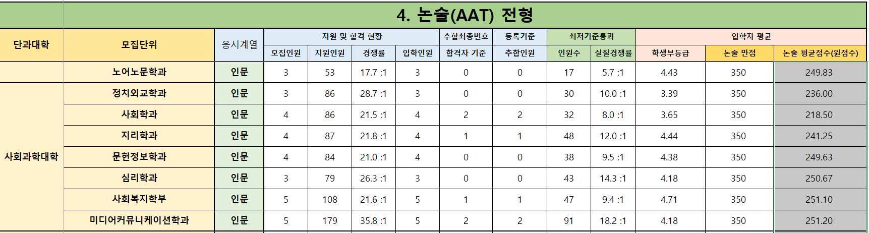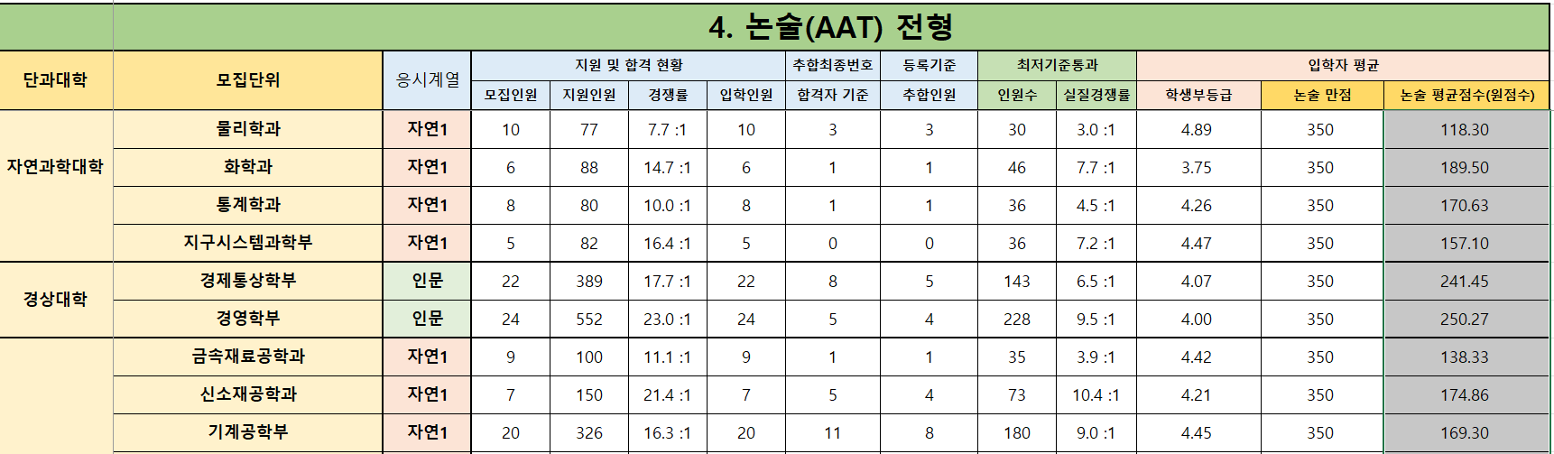 논술(AAT) 전형에서는 학생부등급이 인문대학, 사회과학대학, 자연과학대학, 경상대학, 공과대학 등이 학생부등급은 4점대에 분포해 있는 것이 특징입니다.
