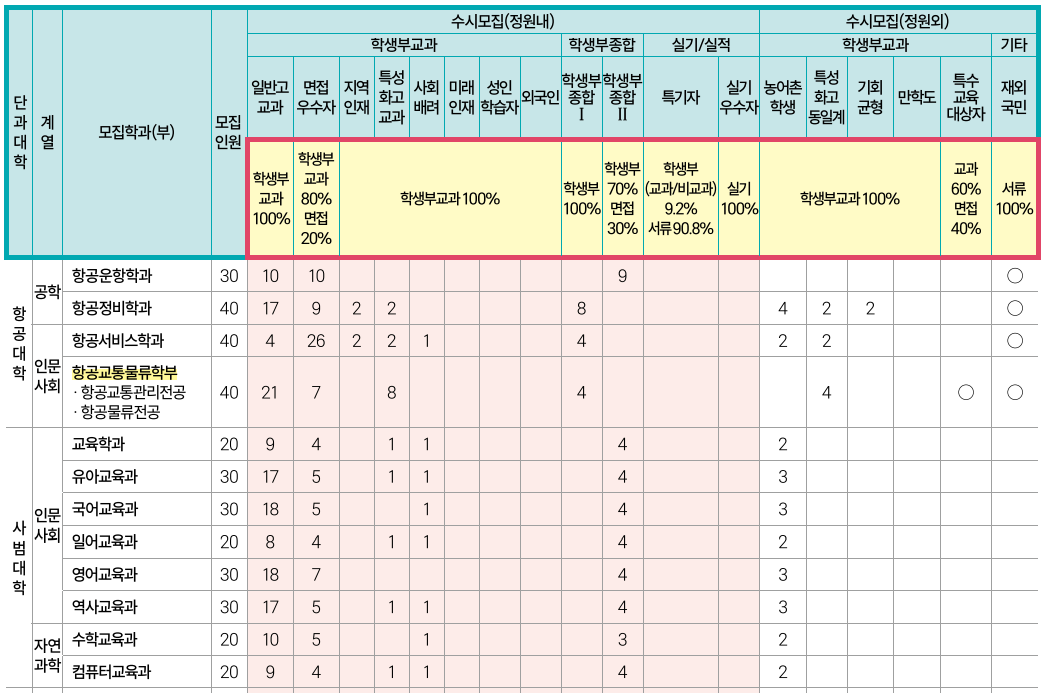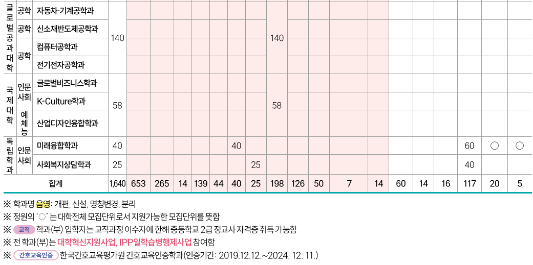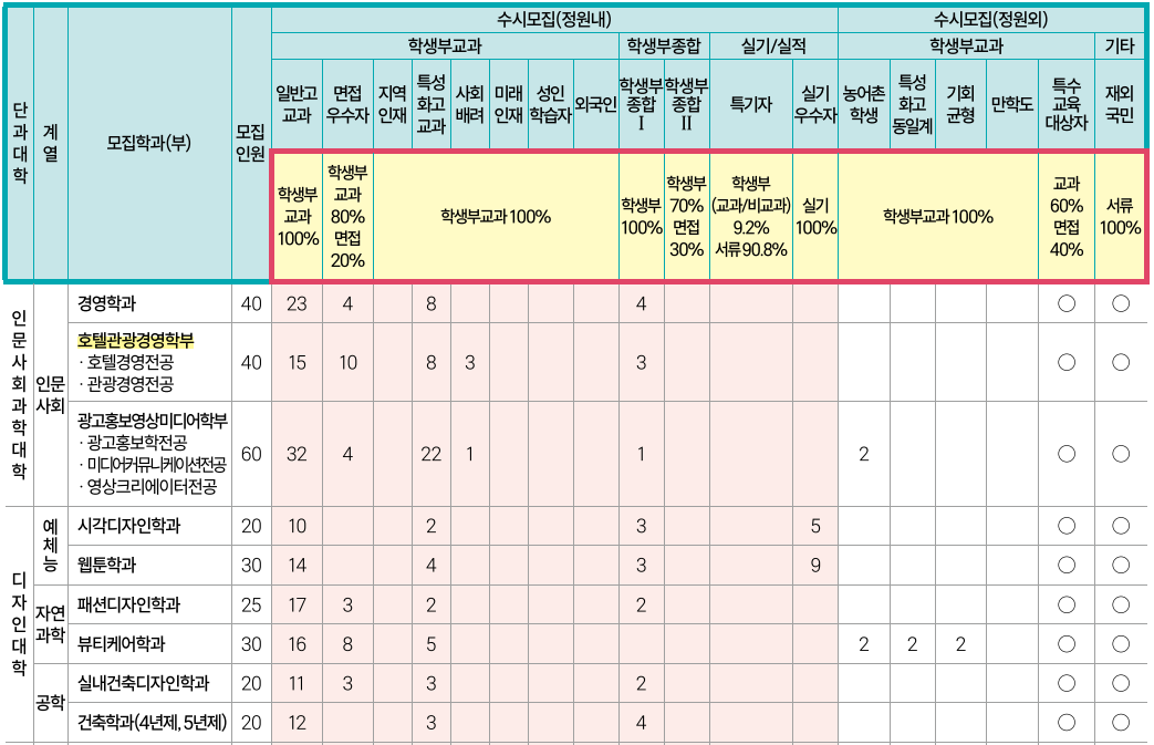 모집단위별로 일반고교과전형, 면접우수자전형, 학생부종합전형, 특성화고교과정형, 지역인재전형, 사회배려대상자전형에 대한 각각의 경쟁률과 후보 그리고 학생부등급 평균과 최저가 표기도어 있습니다.