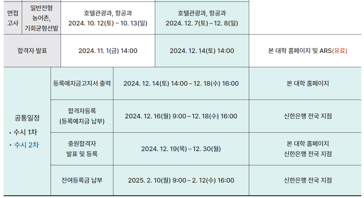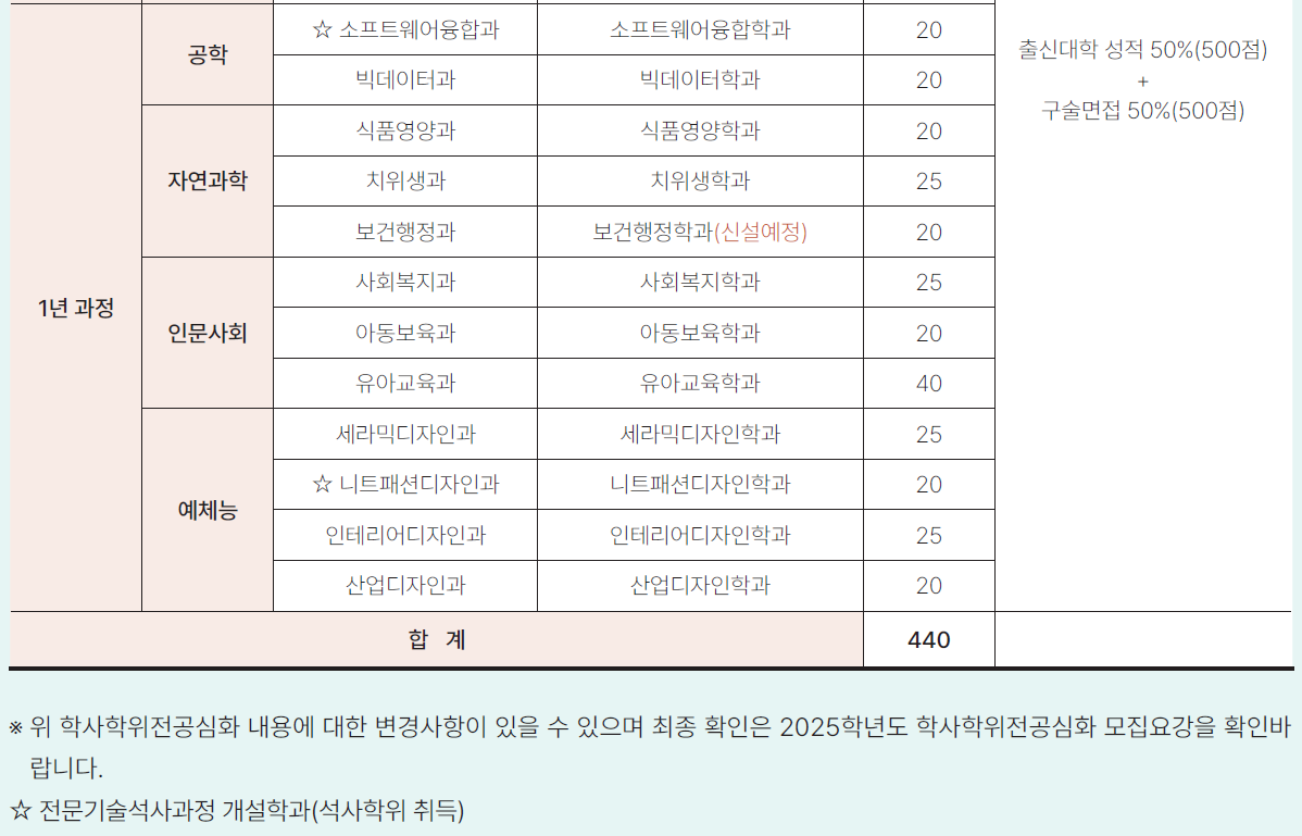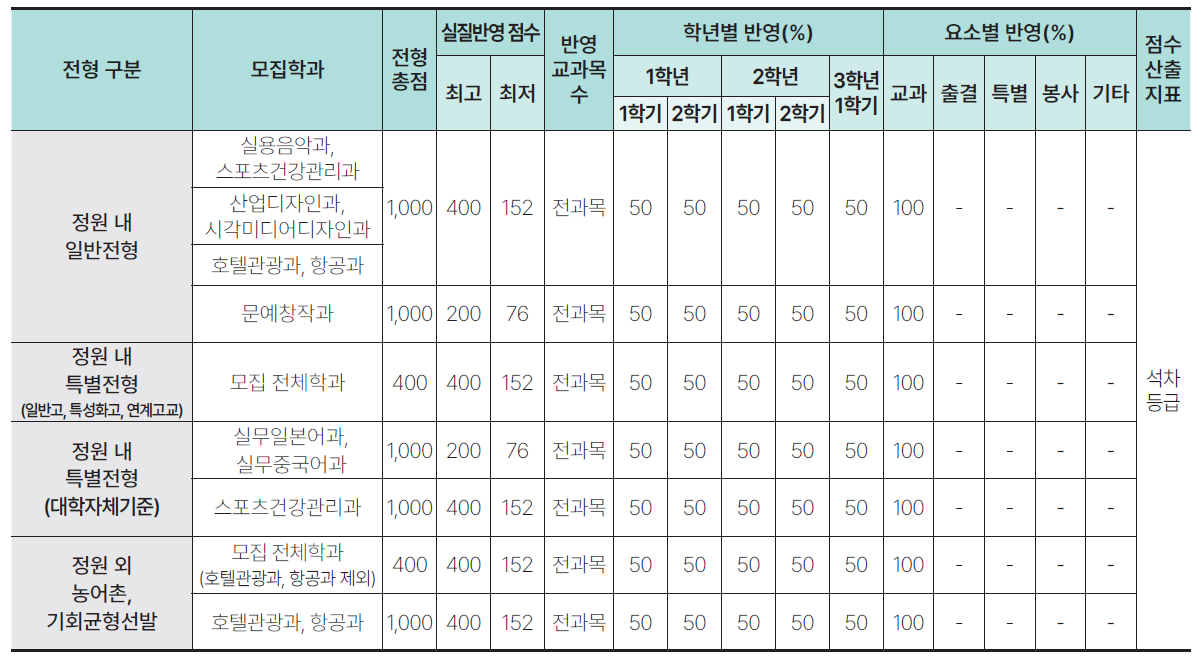 - 미달 학과발생 시 타전형(일반, 특별, 대학자체기준)지원자로 선발합니다.