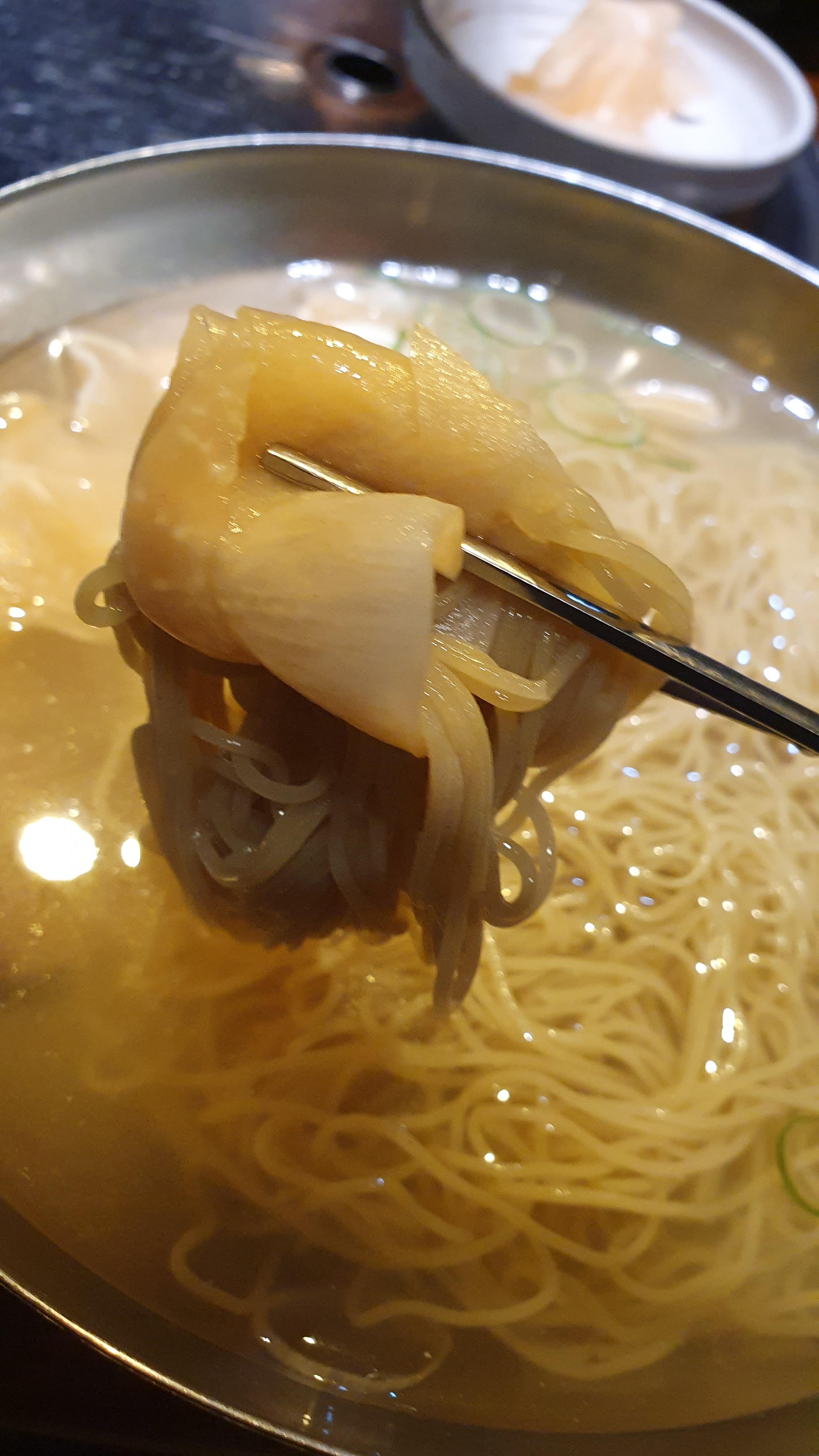 서경도락 평양냉면 육수는 양지와 사태로만 우러내어 맑고 은은한데 이 매력에 빠지면 헤어나기 힘들 정도로 맛있네요.